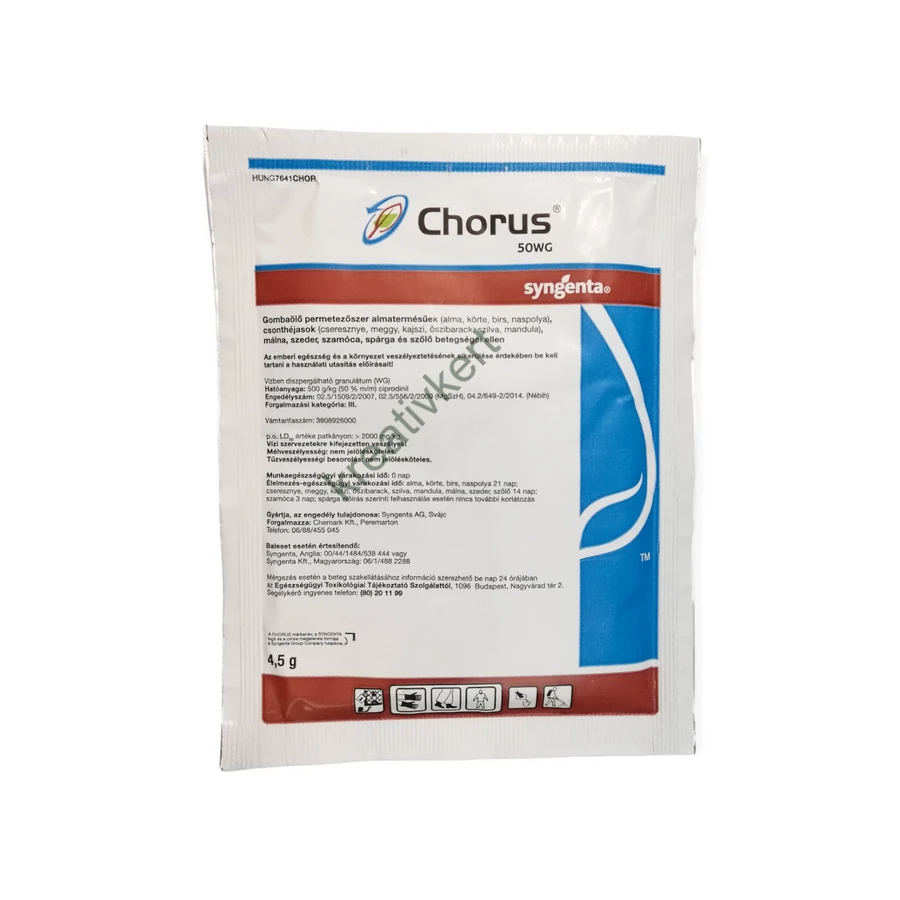 - Almatermésűek (alma, körte, birs, naspolya) varasodás és monília 0,4-0,45 kg/ha. A Chorus-t kifejezetten a korai varasodásfertőzések ellen fejlesztették ki. Ez általában egérfül állapot és a virágzás időszakában, az aszkospóra-szóródás kezdetétől van. A Chorus szisztemikus készítmény (2 óra alatt felszívódik) és belülről véd, kuratív hatással rendelkezik. Egyedülálló tulajdonsága, hogy alacsony hőmérsékleten is hat, még fagypont közeli hőmérsékleten is alkalmazható. A Chorus-t egérfül állapottól sziromhullásig lehet kijuttatni 1–3 alkalommal. Lisztharmatra fogékony (pl. Jonathan) fajtában a Chorus-t egészítsük ki Thiovit Jet-tel. É.V.I.: 21 nap