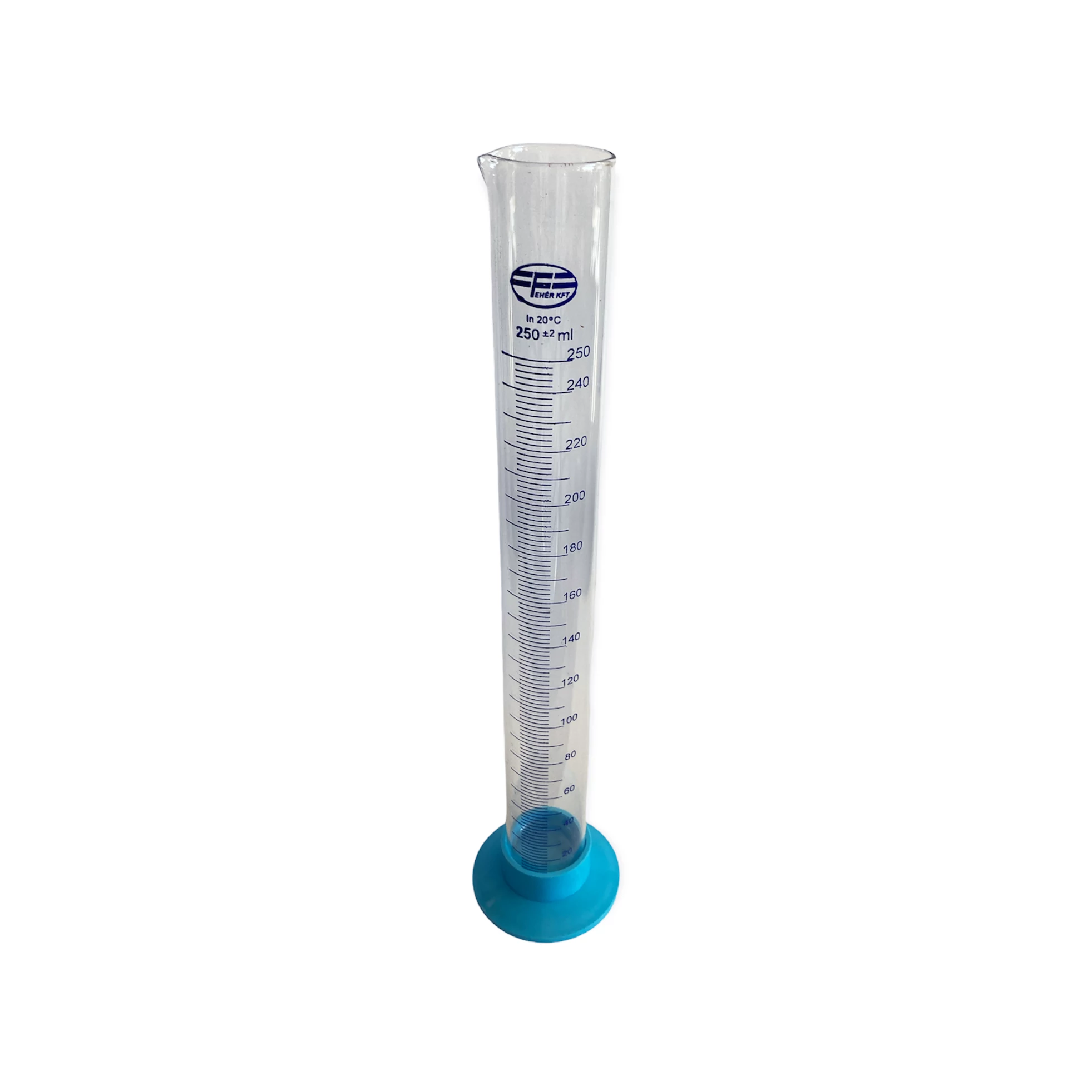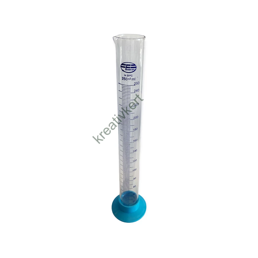 Üvegből készült 250 ml-es mérőhenger, alján műanyag lábbal. Teljes magasság 34 cm.