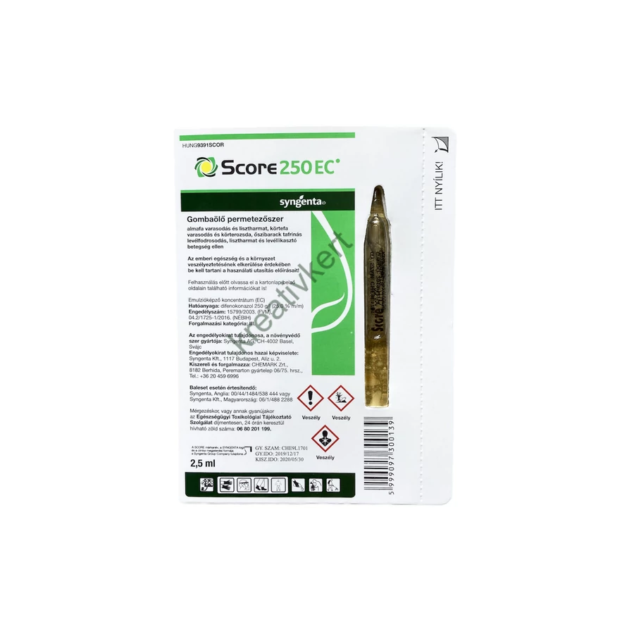 Varasodás, lisztharmat, körterozsda ellen 0,2–0,25 l/ha dózisban. A Score-t az alma legérzékenyebb növekedési szakaszában javasoljuk a varasodás (fuzikládium) elleni védekezésre. A Score egyedülálló tulajdonsága, hogy a csapadékhullás kezdetétől számított 96 órán (4 napon) belül kijuttatva is képes a varasodás fejlődését leállítani és a tünetek megjelenését megakadályozni. A Score-t sziromhullástól ajánljuk az alma védelmére blokkszerűen, 7–10 naponként kijuttatva. A Score a permetezést követően gyorsan felszívódik és védelmet nyújt az intenzív növekedési időszakban is. A Score-os kezelések előtt egérfüles állapottól a Chorus-t célszerű alkalmazni. A körtevarasodás elleni védelem megegyezik az almánál leírtakkal. | 14 nap |