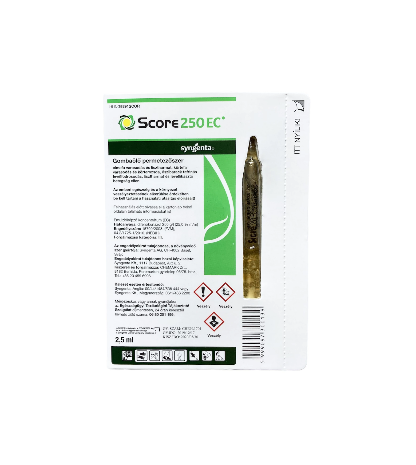 | 250 g/l difenokonazol | N (környezeti veszély). Vízi szervezetekre közepesen veszélyes. Méhveszélyesség: nem jelölésköteles. |